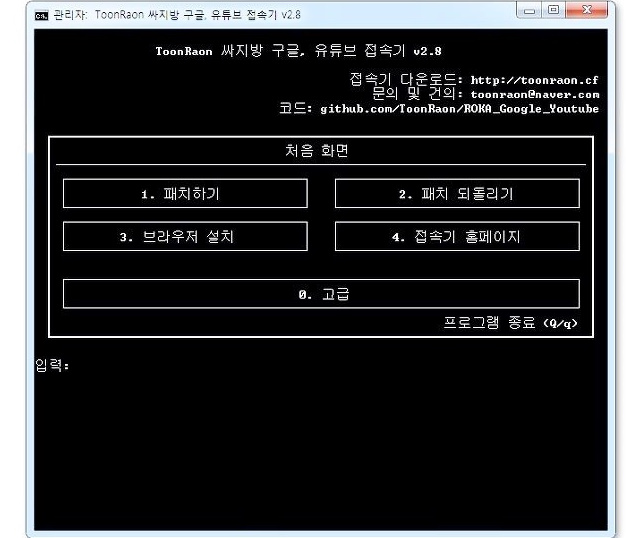 입력란에 숫자 1을 넣어주시고 엔터를 누르면 자동 패치가 시작되고 패치가 완료되면 유튜브에 접속하실수 있습니다.