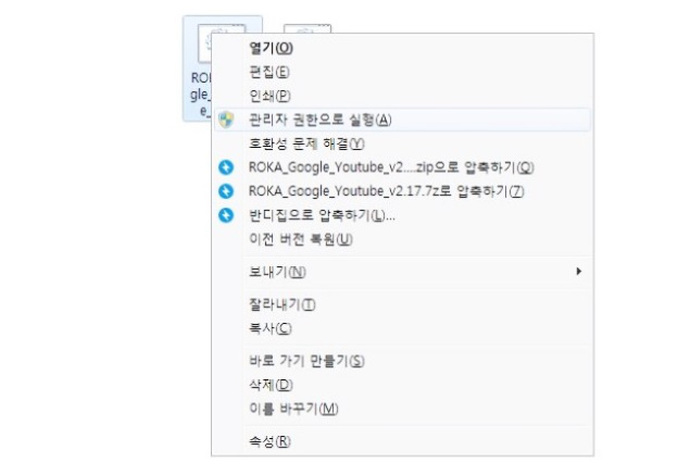 두 파일중에 좌측에 있는 ROKA_Google_Youtube 파일을 오른쪽 마우스클릭해 관리자 권한으로 실행해줍니다.