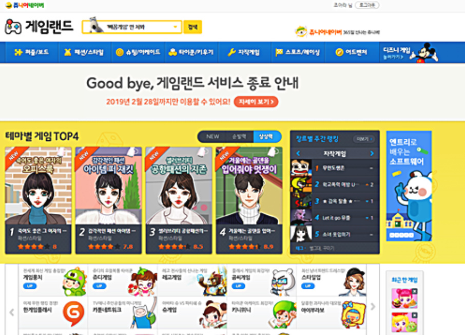 네이버에서 제공하는 어린이 전용포털인 쥬니어네이버에서 제공된 서비스였던 게임랜드가 올해 1월 서비스가 종료가 되었죠?