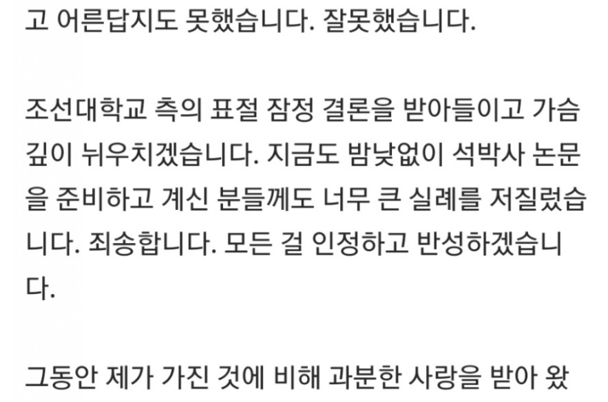 조선대학교 측의 표절 잠정 결론을 받아들이고 가슴 깊이 뉘우치겠습니다. 지금도 밤낮없이 석박사 논문을 준비하고 계신 분들께도 너무 큰 실례를 저질렀습니다. 죄송합니다. 모든 걸 인정하고 반성 하겠습니다.