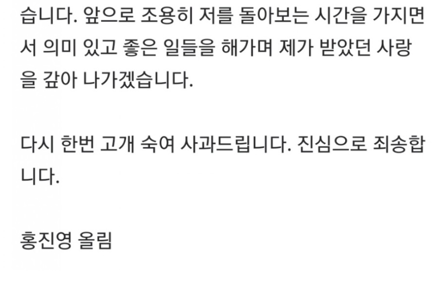 그동안 제가 가진 것에 비해 과분한 사랑을 받아 왔습니다. 앞으로 조용히 저를 돌아보는 시간을 가지면서 의미있고 좋은일들을 해가며 제가 받았던 사랑을 갚아 나가겠습니다.