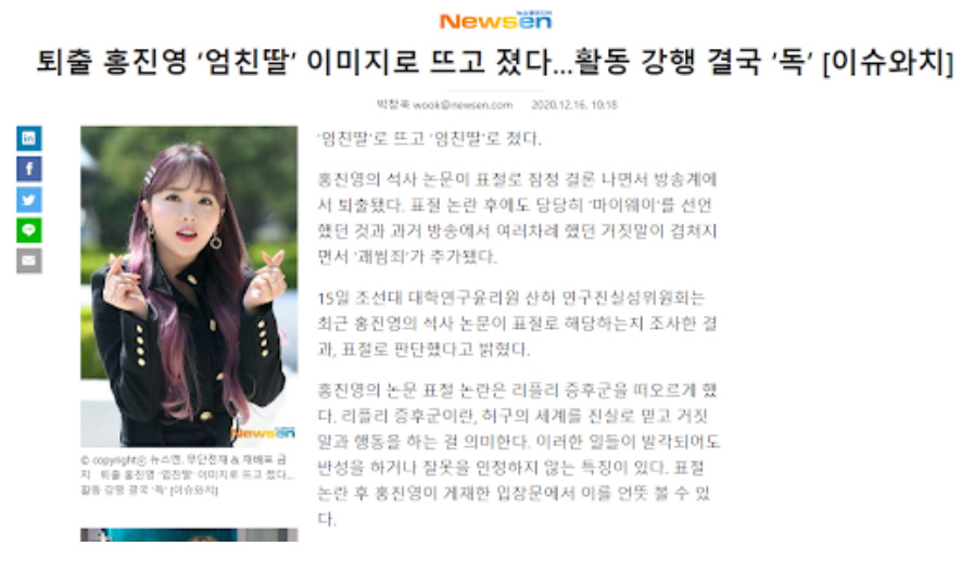 가수 홍진영의 논문표절 논란이 끊이지 않고 있었는데요. 18일에 공식 보도자료를 통해서 "조선대학교 측의 표절 잠정 결론을 받아들이고 가슴 깊이 뉘우치겠다"고 입장을 밝혔다고 합니다.
