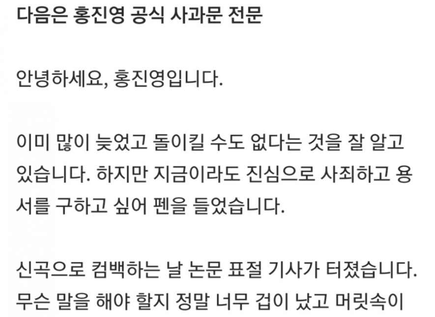 홍진영은 18일 저녁 자신의 인스타그램을 통해서 "이미 많이 늦었고 돌이킬 수 없다는 것을 알고 있다" 라며 "지금이라도 진심으로 사죄하고 용서를 구하고 싶어 펜을 들었다" 라고 써놨습니다.
