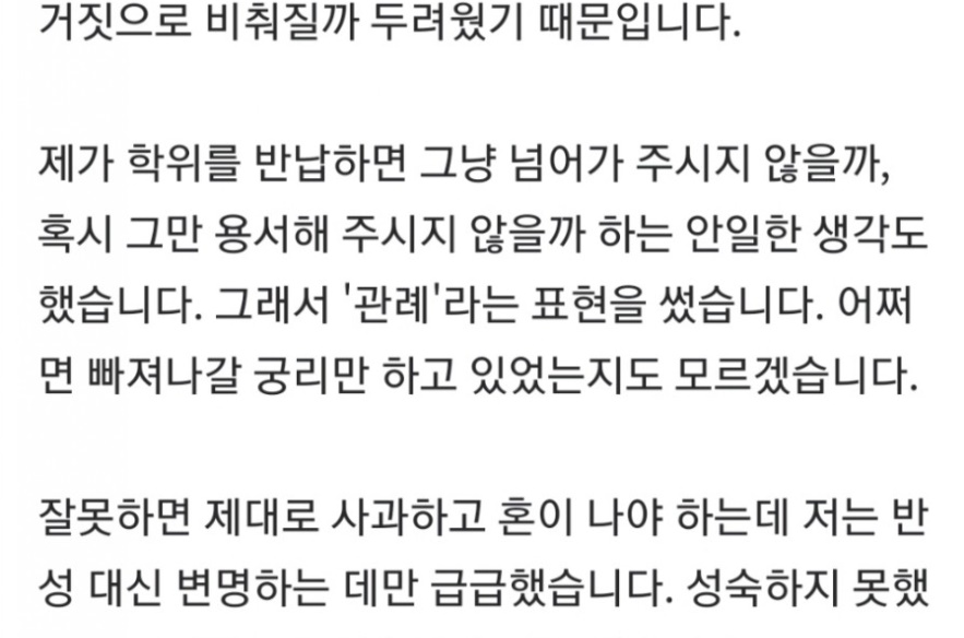 잘못하면 제대로 사과하고 혼이 나야하는데... 저는 반성 대신 변명하는 데만 급급했습니다. 성숙하지 못했고 어른답지도 못했습니다. 잘못했습니다.