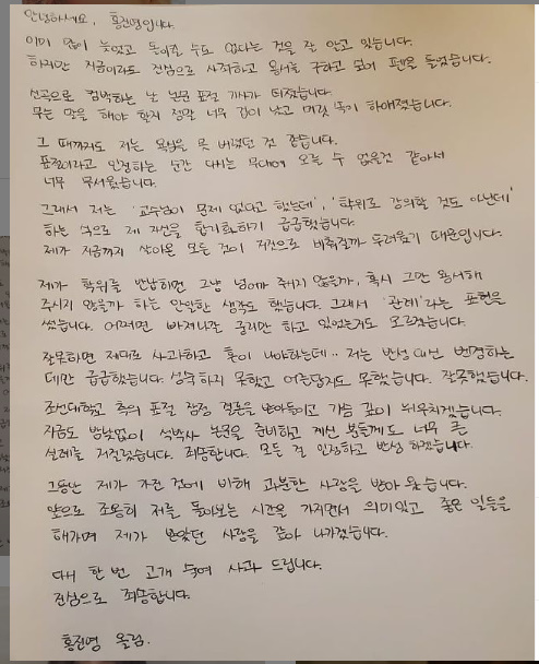 홍진영은 악화되는 여론과 조선대측의 논문 표절 결론을 인정하고 사과문을 올렸습니다.