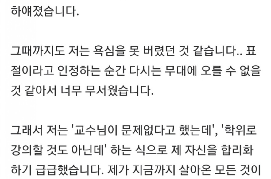 그 때까지도 저는 욕심을 못 버렸던 것 같습니다.. 표절이라고 인정하는 순간 다시는 무대에 오를 수 없을 것 같아서 너무 무서웠습니다.