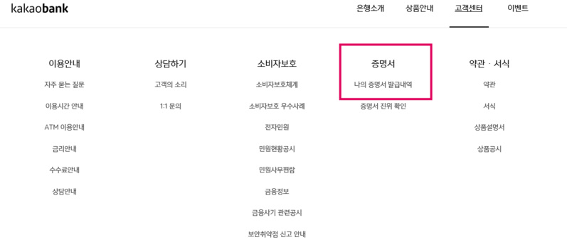 카카오뱅크 PC 웹사이트의 고객센터 페이지로 이동하여 증명서 > 나의증명서 발급내역 메뉴로 들어가주세요.