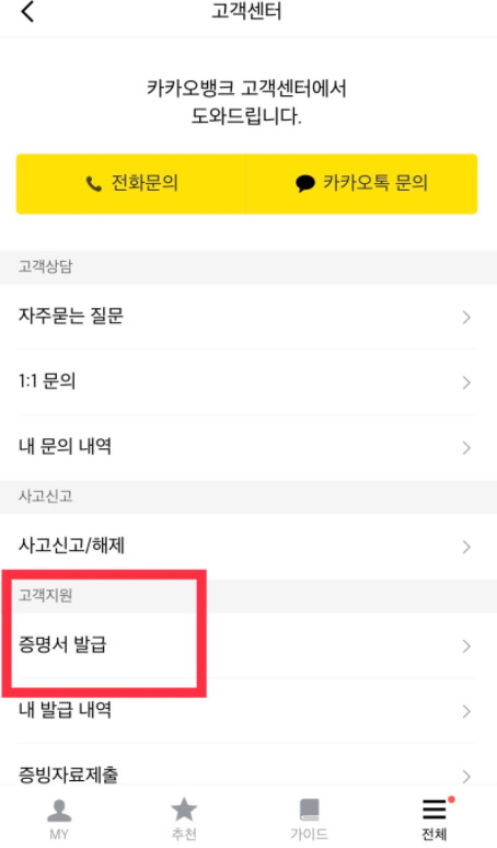우선은 모바일 카카오뱅크에서 전체페이지 > 고객센터로 이동해주세요.