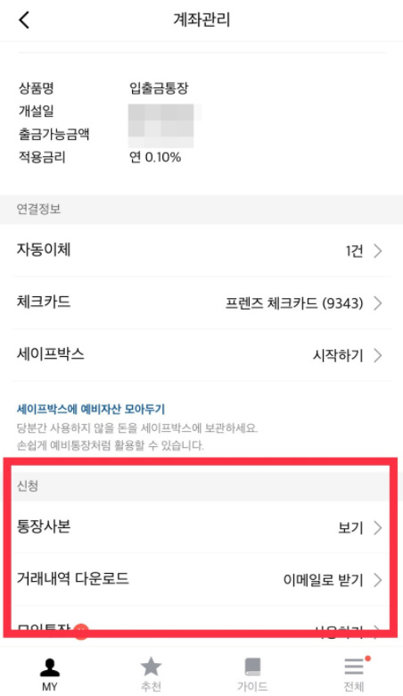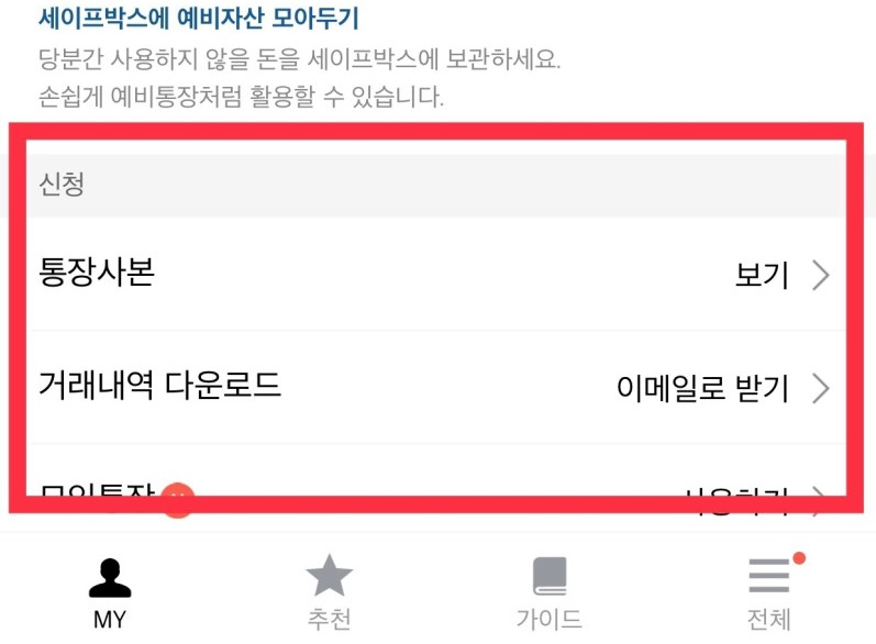 통장사본 모바일발금과 같은 방법으로 계좌관리 메뉴로 들어가서 신청에 있는 거래내역 다운로드를 하시면 됩니다.