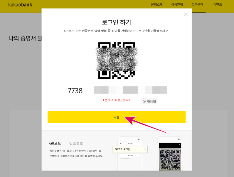 로그인을 누르면 QR코드 혹은 인증번호가 나오는데 카카오뱅크 모바일에 입력해줍니다.