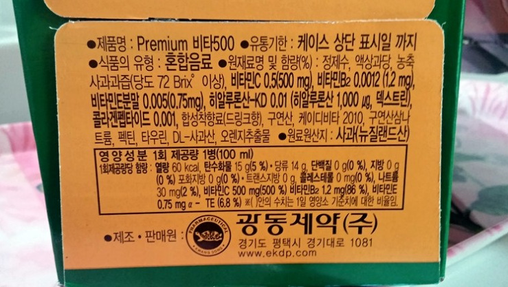 무카페인이죠! 카페인이 있다는 오해가 많은 비타500 은 광동제약에서 카페인이 일체 첨가되지 않았다는 기사를 낸적도 있다고 합니다. 비타500은 비타민C와 사과즙, 물을 섞어 만들어 방부제나 색소는 전혀 들어가지 않았다고 합니다!!