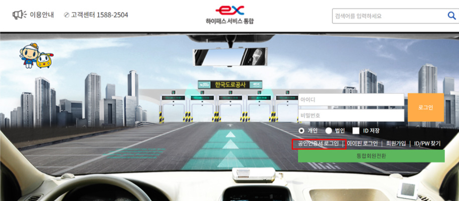 하이패스 서비스 통합 사이트에 들어가셔서 메인화면에서 로그인을 진행해야 합니다. 공인인증서가 있으시면 공인인증서 로그인을 통해서 로그인을 해주시고 모바일 앱에서 확인을 하고 싶으시다면 무료 회원가입을 해서 로그인 해주시면 됩니다.