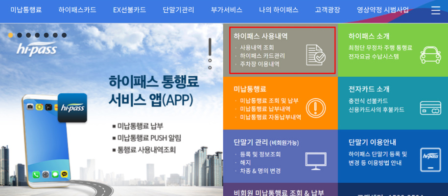 로그인이 되었다면 메인화면에서 하이패스 사용내역 부분을 클릭해서 들어가주시면 통행료가 쉽게 조회 됩니다.