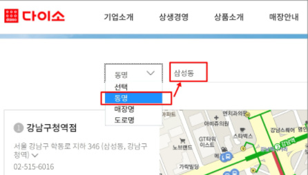 1. 다이소 홈페이지 : 매장안내 > 매장검색 > "동명" 으로 검색