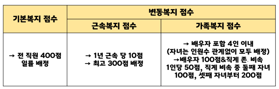 복지점수는 전 직원에게 다 똑같이 배정이 되는 기본복지점수가 있고 조건에 따른 변동복지 점수가 있습니다.