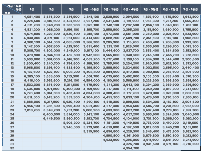 올해 새로 개정된 봉급표 입니다.