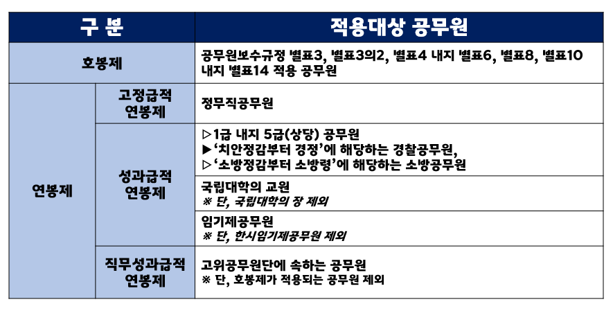 일반직과 별정직 등의 1~5급 공무원등과 임기제공무원들을 대상으로 적용이 되는 연봉제입니다.
