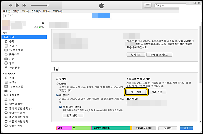 ▼ '지금백업' 버튼을 눌러서 자료를 공장초기화할 아이폰에 있는 데이터를 백업해주세요.