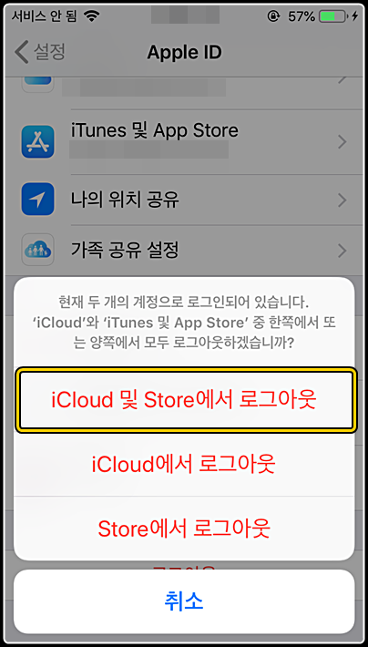 ▼ 'iCloud 및 Store에서 로그아웃' 버튼을 눌러주세요. 지금 상태에서 완전히 벗어나버리시자구요.
