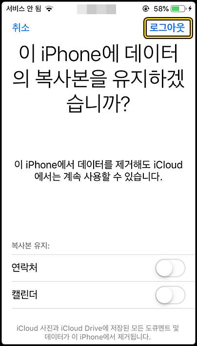 ▼ iCloud에 연락처 및 캘린더의 복사본을 유지하고 싶으시면 각 활성황 버튼을 눌러주세요. 저는 데이터 백업이 완료된 상황이기 때문에 뒤도 안돌아보고 '로그아웃' 버튼을 눌렀습니다. 그리고 이미 관련 데이터는 아이클라우드에 백업이 되어있는 상황이기도 하구요.