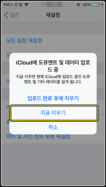 ▼ iCloud 도큐멘트 및 데이트 업로드 관련 메세지가 생성됩니다. '지금 지우기' 버튼을 눌러서 진행합니다.