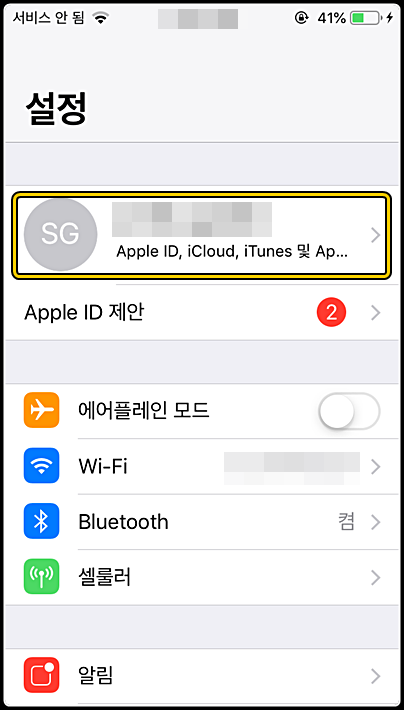 ▼ 설정 메인화면에서 Apple ID 및 iCloud, iTunse 및 Appstore... 라고 표시된 부분을 클릭합니다.