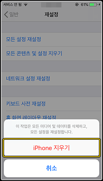 ▼ 그리고 대망의 'iPhone 지우기' 버튼이 나타났습니다. 휴대폰을 타인에게 팔아야 하는 상황이라면 주저하지 마시고 지우기 버튼을 눌러주세요.