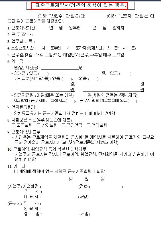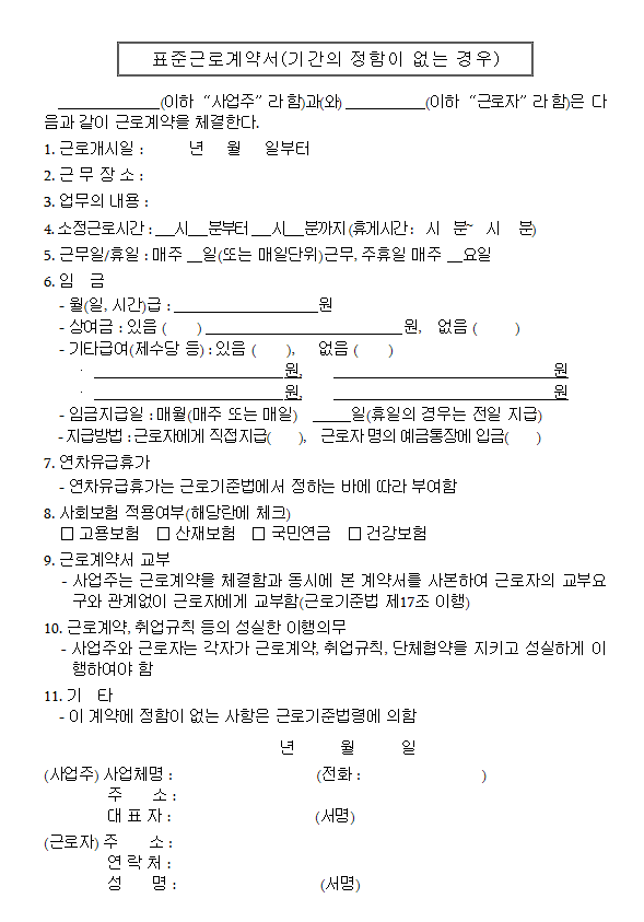 보통 일반적 회사들은 자체적으로 근로계약서를 작성후 배포하지만 작은 영세한 사업장들은 별도로 근로계약서를 구비하지 않은 경우도 있어서 매해 고용노동부에서 표준 근로계약서 양식을 작성해 배포하기 때문에 참고해 작성하기 좋습니다.