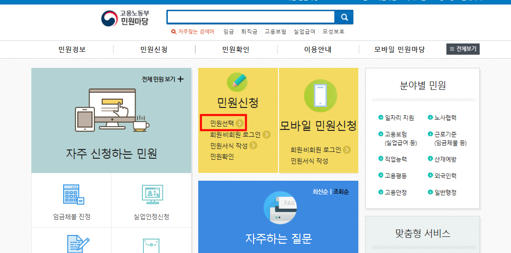 고용노동부 민원마당에 접속하여 민원선택을 선택합니다.