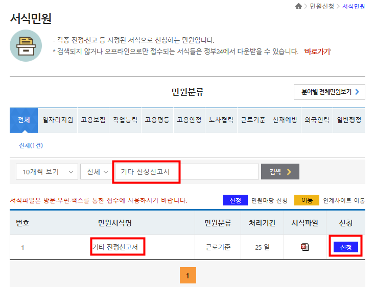 근로계약서 미작성에 관해 별도 신고서는 없기 떄문에 검색 창에 기타 진정신고서로 검색하여 신청을 선택합니다.