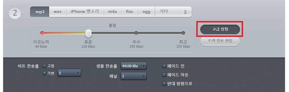 그 아래 결과물의 파일 형식을 선택하는 탭과 음질 퀄리티를 선택하는 바가 하나 있습니다. 수가 크면 클수록 더 높은 음질로 변환되며 용량도 증가합니다.