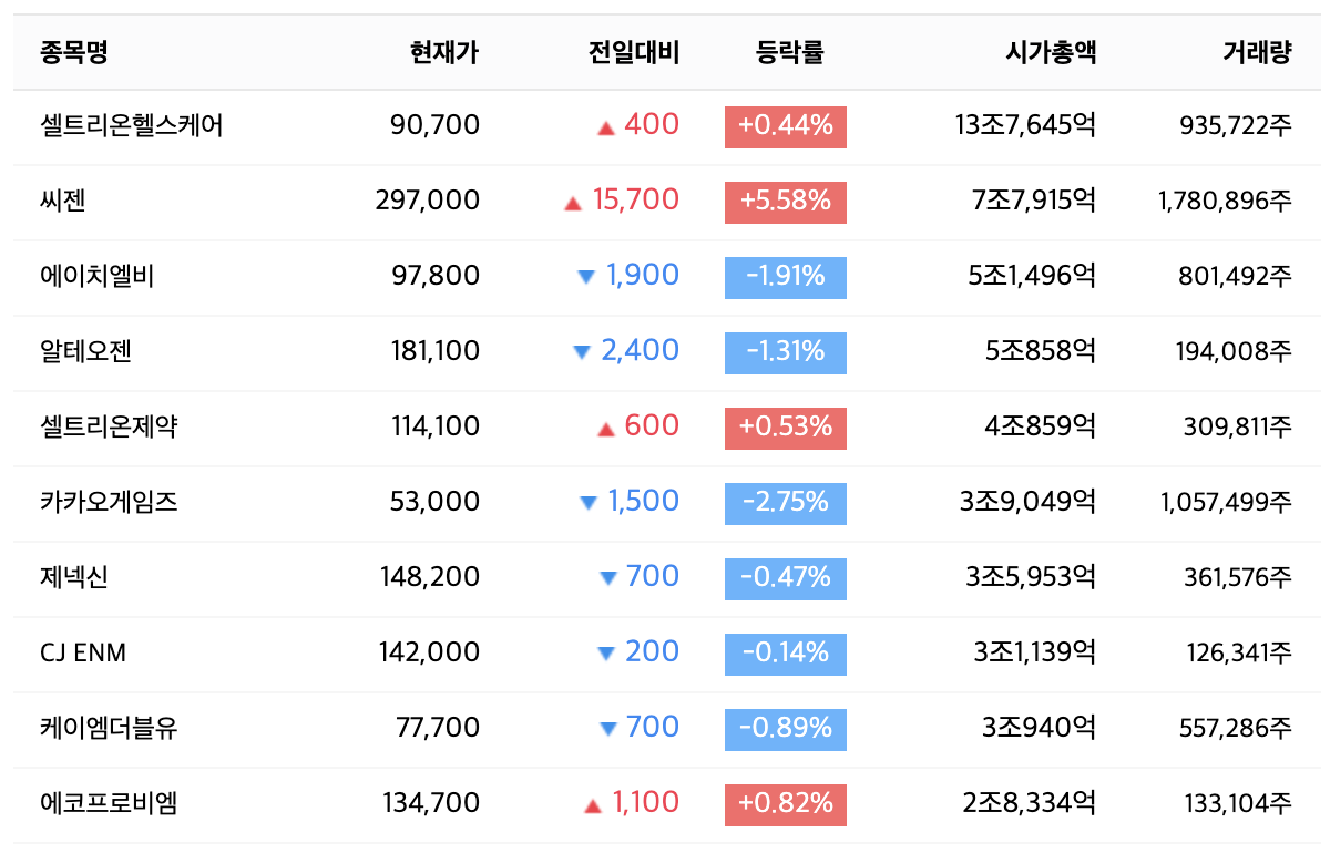 2020년 10월 기준 코스닥 시총순위 TOP 10