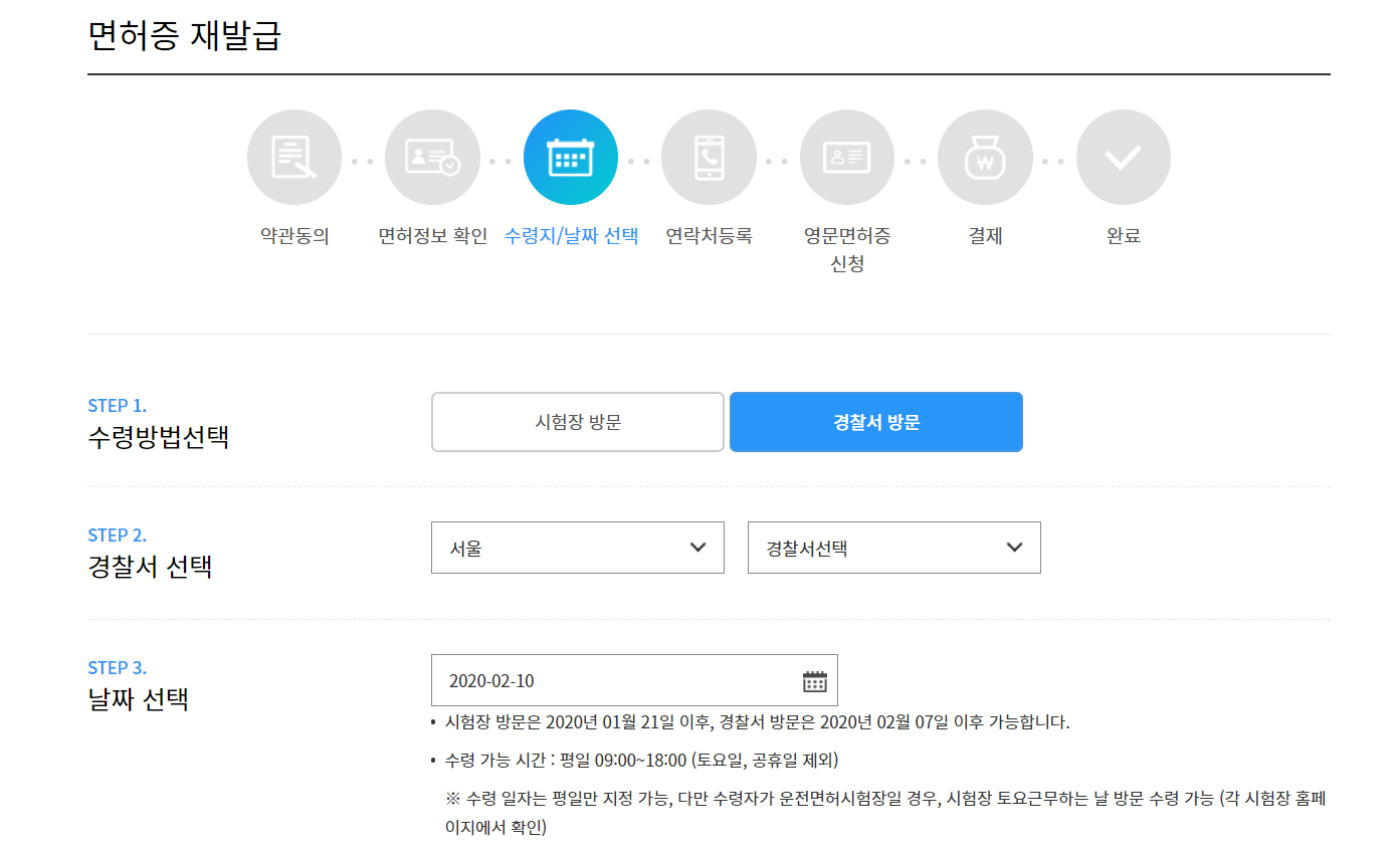 면허증 재발급 3단계에서는 수령방법과, 방문지역, 예약 날짜를 선택하면 됩니다. 면허시험장과 거리가 있는 분들은 경찰서 방문을 선택하여 최대한 가까운 거리에 있는 지역에 경찰서를 선택해줍니다. 날짜는 자신이 원하는 날짜로 선택해주면 되는데 예약불가한 날짜도 있으니 예약가능한 날짜에 맞춰 선택해야 됩니다.