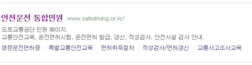 검색을 하면 안전운전 통합민원 홈페이지가 나타납니다. 안전운전 통합민원 홈페이지에서는 교통안전교육, 운전면허시험, 운전면허 발급 및 갱신, 적성검사, 안전시설 검사 안내 등 다양한 서비스를 이용하실 수 있습니다.