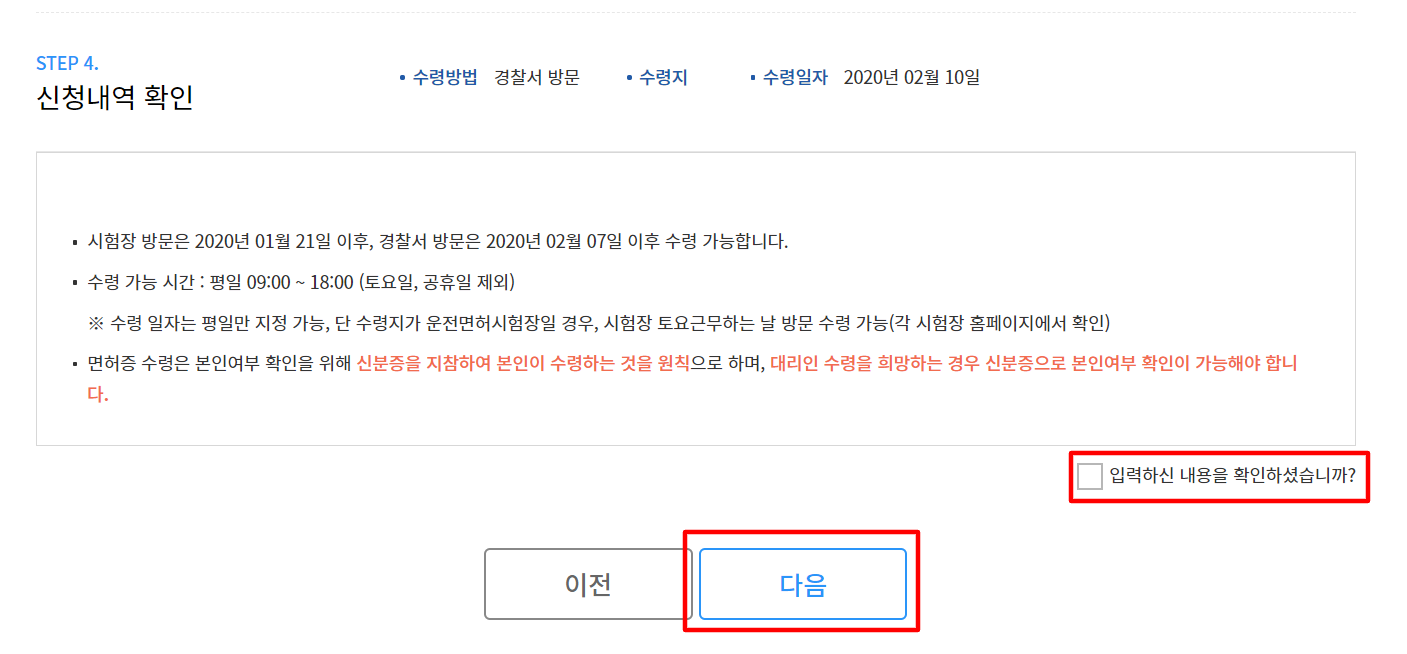 수령지와 날짜를 선택하였다면 아래로 내려와 신청내역을 한번 더 확인합니다. 자신이 선택한 수령지와 날짜가 맞다면 체크와 함께 다음 단계로 이동해줍니다.