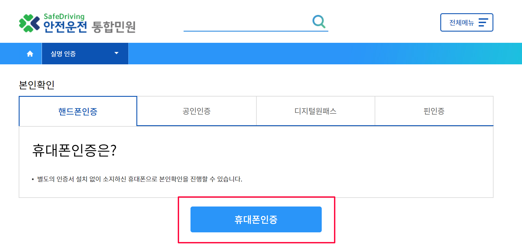 운전면허증 분실신고 및 재발급을 신청하기 위해선 본인확인을 해야합니다. '핸드폰인증', '공인인증', '디지털원패스', '핀인증' 등 다양한 본인인증 확인이 가능하니 자신이 원하는 방법으로 본인인증을 해주시기 바랍니다.