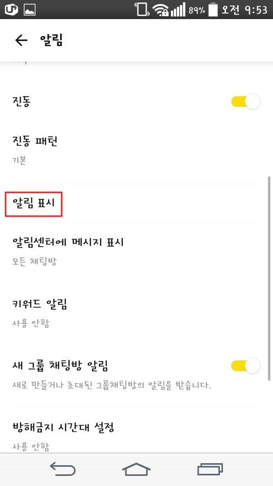 계속해서 설정메뉴에서 알림 > 알림표시 순으로 선택해주세요~