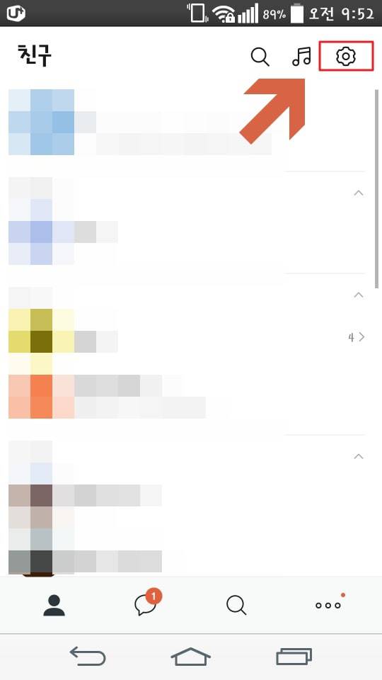 모바일에서 카카오톡을 실행해준 다음, 우측 상단에 보이는 톱니바퀴 노양을 선택해주세요. 안드로이드도 메뉴위치만 다르고 비슷하니 한번 보시면서 해보시면 될 것 같습니다.