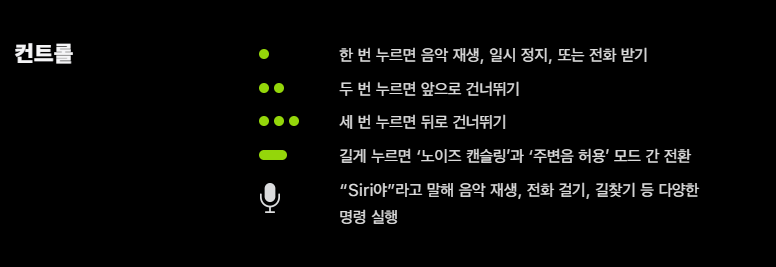 마지막으로 주요기능들을 정리해놓은 사진을 가져와봤습니다. 에어팟프로에보면 평평한 부분이 있을텐데 그 부분을 탭해서 사용하는 기능들입니다. 그 부분을 한번 누르게 되면 음악 재생을 하거나 일시정지 또는 전화가 왔을때 전화를 받을 수있고, 두번 탭할경우에는 건너뛰기 세번 탭할경우에는 뒤로 건너뛰기가 가능합니다. 그리고 길게 누르게 되면 노이즈 캔슬링이 활성화되니 굳이 아이폰을 꺼내지 않고도 어느정도는 에어팟프로를 컨트롤 할 수 있겠지요?