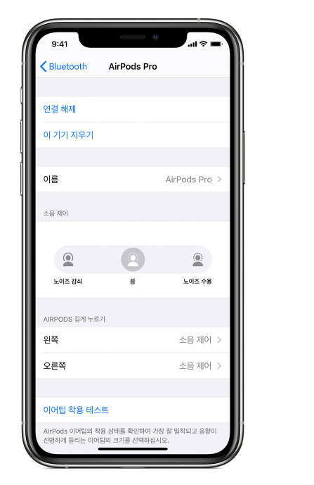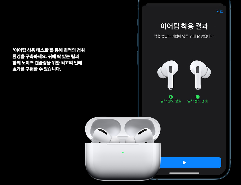 아무래도 에어팟프로를 사용하시는 분들의 대부분이 노이즈 캔슬링 기능을 기대하고 구매하시는 분들이라고 생각되는데요, 노이즈 캔슬링을 사용하는경우에 에어팟프로가 사용자의 귀에 잘맞아야하기 때문에 처음사용하시는 분들이라면 이어팁 착용테스트를 진행해보시는 것도 좋을 것 같습니다.
