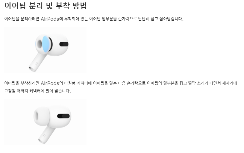 이어팁 분리 및 부착방법은 다음과 같습니다. 에어팟프로를 구매하시면 기존의 에어팟과는 다르게 크기별로 이어팁이 제공되는데 사진처럼 이어팁을 잡아당겨서 적절히 끼워주면 됩니다. 커널형 이어폰을 사용해보신 분들이라면 쉽게 사용하실 수 있을겁니다.