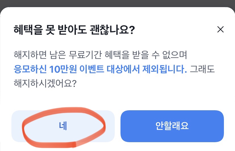 5) 마지막으로 다시 한번 이벤트 관련 질문에 "네" 선택을 하면 해지 처리가 된다.