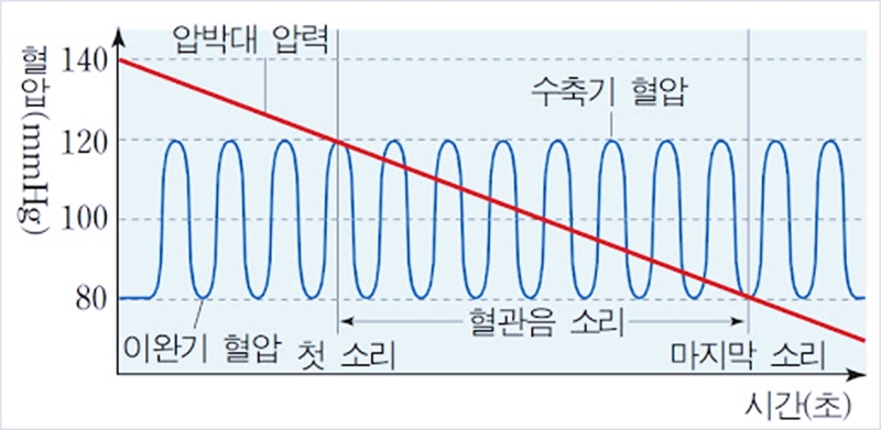 수축기 혈압과 이완기 혈압을 통해서 고혈압이 여부를 판단할 수 있습니다. 팔에서 측정한 동맥의 압력은 좌심실이 수축했을 때 높아지고 이완할 때 낮아지는 파동 형태를 띕니다. 여기서 좌심실이 수축했을 때 가장 높아지는 동맥의 압력을 '수축기 혈압'이라고 하며, 반대로 가장 낮아지는 동맥의 압력을 '이완기 혈압'이라고 합니다.