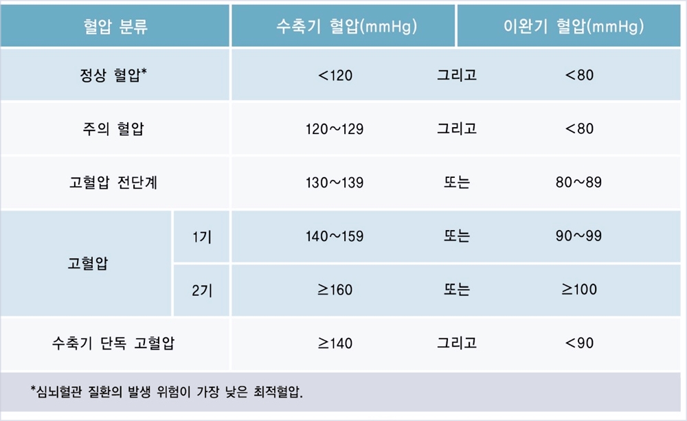 성인이 2회 이상 혈압을 측정했을 때 수축기 혈압이 140mmhg 이상을 계속 유지하거나 이완기 혈압이 80mmhg 이상을 계속 유지했을 때 이를 '고혈압 1기'라고 분류합니다. 160mmhg 이상을 계속 유지하거나 이완기 혈압이 100mmhg 이상을 유지했을 때는 '고혈압 2기'로 분류합니다.