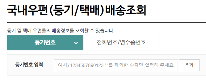 노출 되는 페이지를 확인 시 국내우편(등기/택배)배송조회 영역이 노출되는데요. 여기서 등기번호 또는 전화번호/영수증번호 입력 방식을 사용하여 준등기 우편물의 위치를 조회 해보실 수 있습니다. 너무 간단하지요?