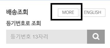 우체국 홈페이지를 접속 하시면 우측영역에 배송조회 [MORE][ENGLISH] 버튼이 노출되시는 것을 확인하실 수 있는데요, 저희는 여기서 [MORE]버튼을 선택해 보도록 하겠습니다.