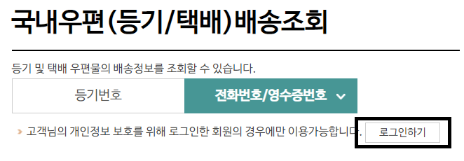 등기번호를 입력하여 준등기 우편물을 조회할 경우에는 로그인이 불필요 하지만 전화번호/영수증번호를 입력하여 조회를 시도할 경우 로그인을 해주셔야 하니 이부분 참고해 주시기 바랍니다.