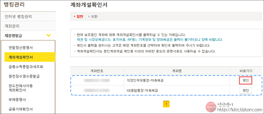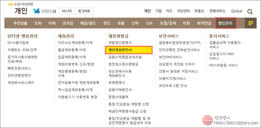 ▷ 국민은행 인터넷 뱅킹 사이트에 접속 후 공인인증서를 이용하여 로그인 한 뒤 상단 메뉴에서 [뱅킹관리] → [계좌개설확인서]를 클릭합니다.