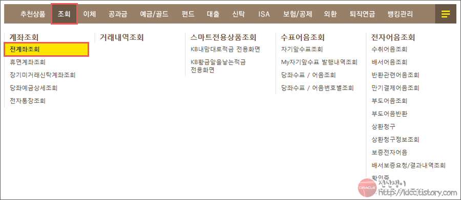 ▷ 또 다른 방법으로는 상단 메뉴의 [조회] → [전계좌조회] 메뉴를 클릭하여 본인이 보유하고 있는 전체 계좌 조회를 진행합니다.