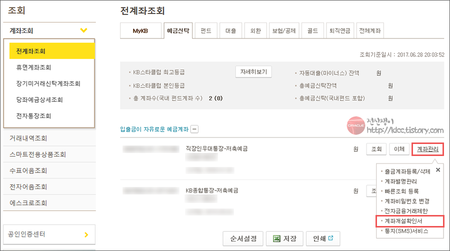 ▷ 전계좌조회 화면에서 통장 사본 출력이 필요한 계좌번호 우측의 [계좌관리] 버튼을 클릭하면 추가로 선택할 수 있는 메뉴들이 나타납니다. 이곳에서 [계좌개설확인서] 메뉴를 선택하셔도 통장사본 인쇄가 가능합니다.